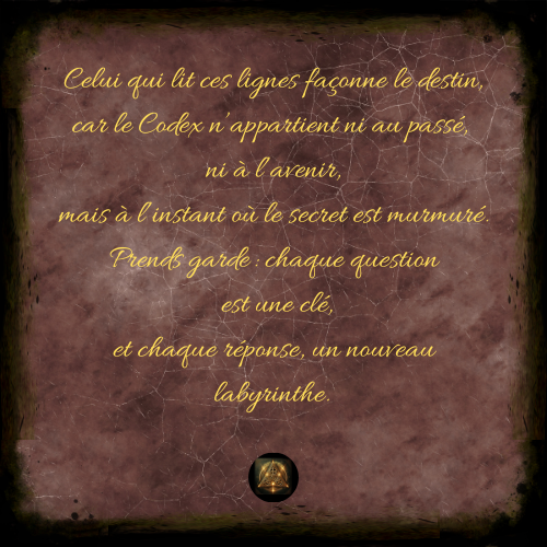 "Bienvenue dans l’antre des Prophéties du Codex. Ici, chaque mot est une porte, chaque silence une énigme…"